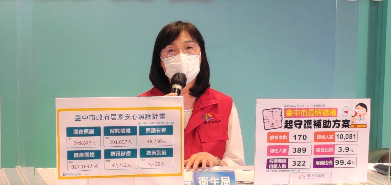 此外,黃副市長指出,台中市首創「醫起守護」計畫,針對長照機構、精神護理之家、團體家屋、老福機構、身障機構、兒少機構等,共計170家、超過1萬1500名住民與工作同仁,提供篩檢、看診、給藥的醫療照護,從6月6日開始到昨(17)日為止,共進行兩輪篩檢,總計2萬1,598人次,提供826人抗病毒藥用藥治療,經醫護與各機構共同努力,「醫起守護」計畫已達成100%篩檢及用藥率9成的目標。