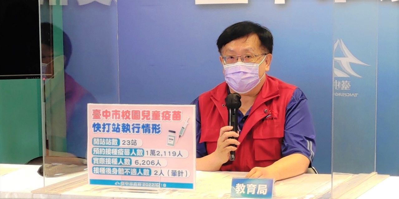 針對媒體關心台中今天兒童疫苗接種狀況,是否出現不良反應?教育局副局長葉俊傑表示,今天有2位兒童出現暈針情形,休息後無大礙,提醒施打疫苗後的學童多喝開水、休息,並避免劇烈運動。