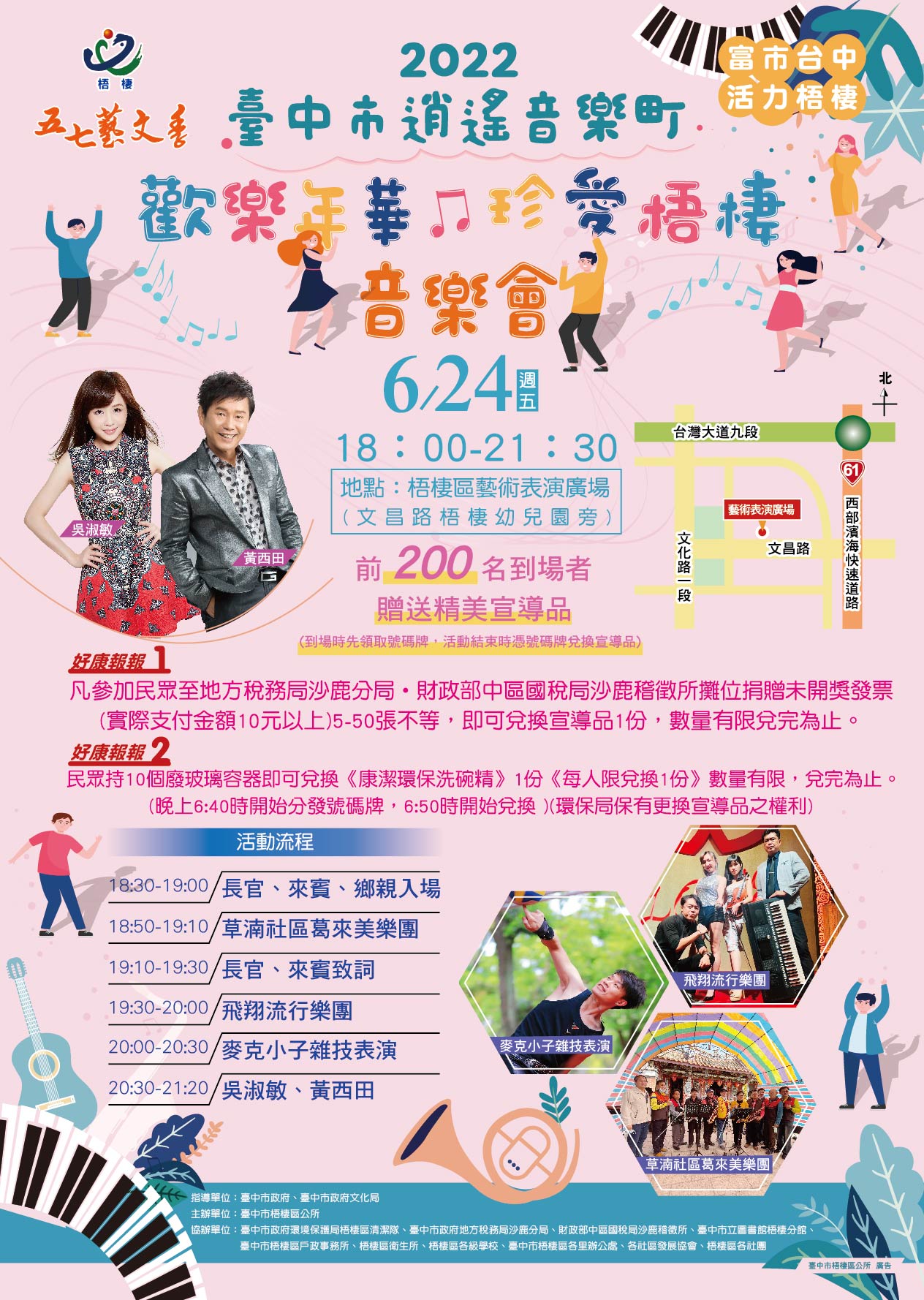 文化局說明,「2022台中市逍遙音樂町」週五晚上6點將在梧棲區藝術表演廣場舉辦「歡樂年華-珍愛梧棲音樂會」,並邀請在地擅長薩克斯風、電吉他、爵士鼓演奏的草湳社區葛來美樂團,以及師承台灣著名李棠華特技團的麥克小子雜技表演,知名藝人吳淑敏、黃西田演唱經典老歌,和民眾一起享受歡樂溫馨的音樂之夜。