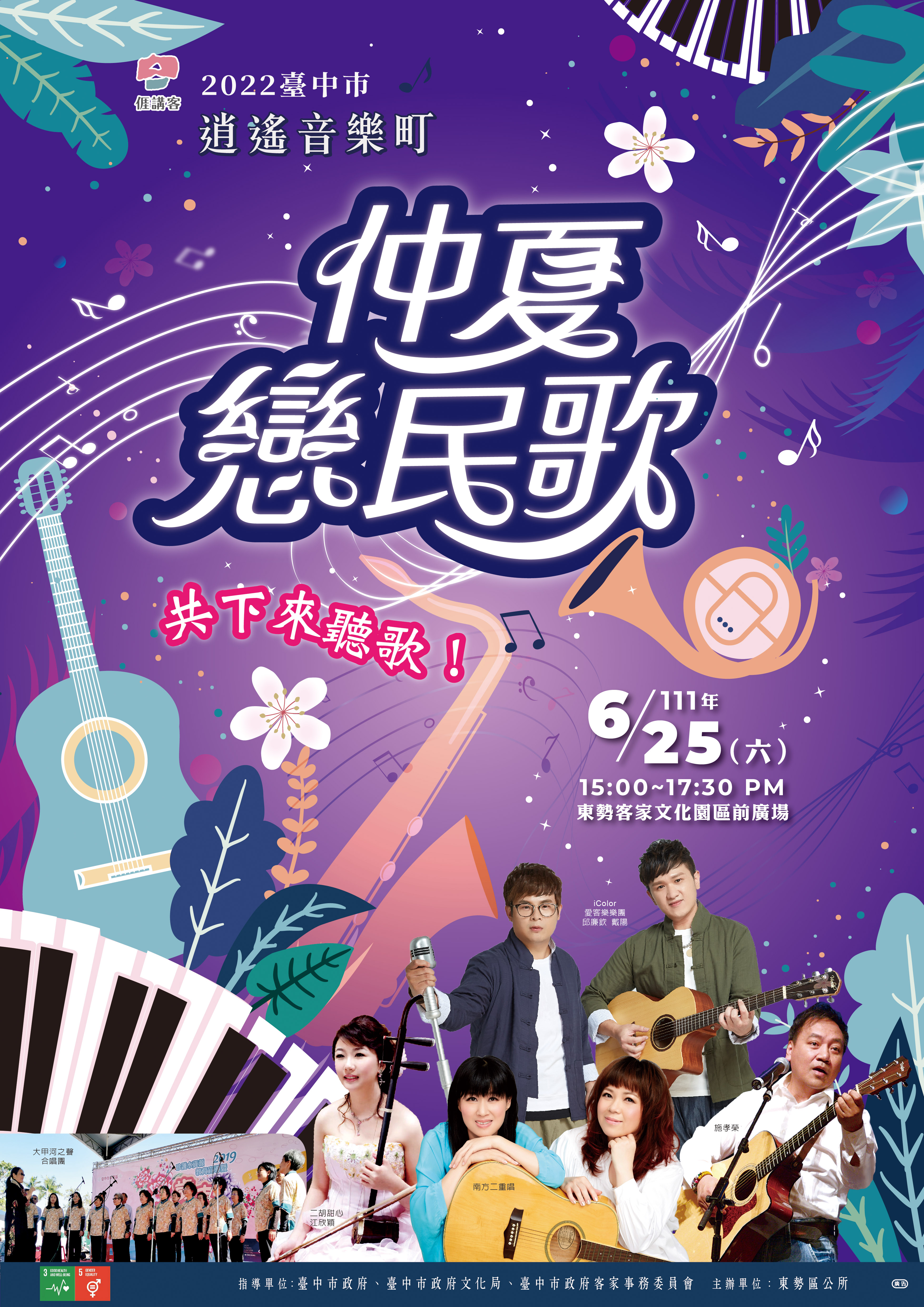 文化局提到,週六則接續舉辦3場音樂會,從下午陸續於東勢客家文化園區、大安區聯合里民活動中心和北區科博館蝴蝶水岸廣場登場。東勢於下午3點辦理「仲夏戀民歌」,由大甲河之聲合唱團演唱大埔腔客家歌謠、街頭藝人江欣穎帶來二胡獨奏,還有金曲客家歌手邱廉欽演唱《月光光123》與《共款个月光》等,知名金曲獎最佳演唱組合南方二重唱及校園民歌代表施孝榮也將演唱經典民歌,展現客家多元融合文化特色。