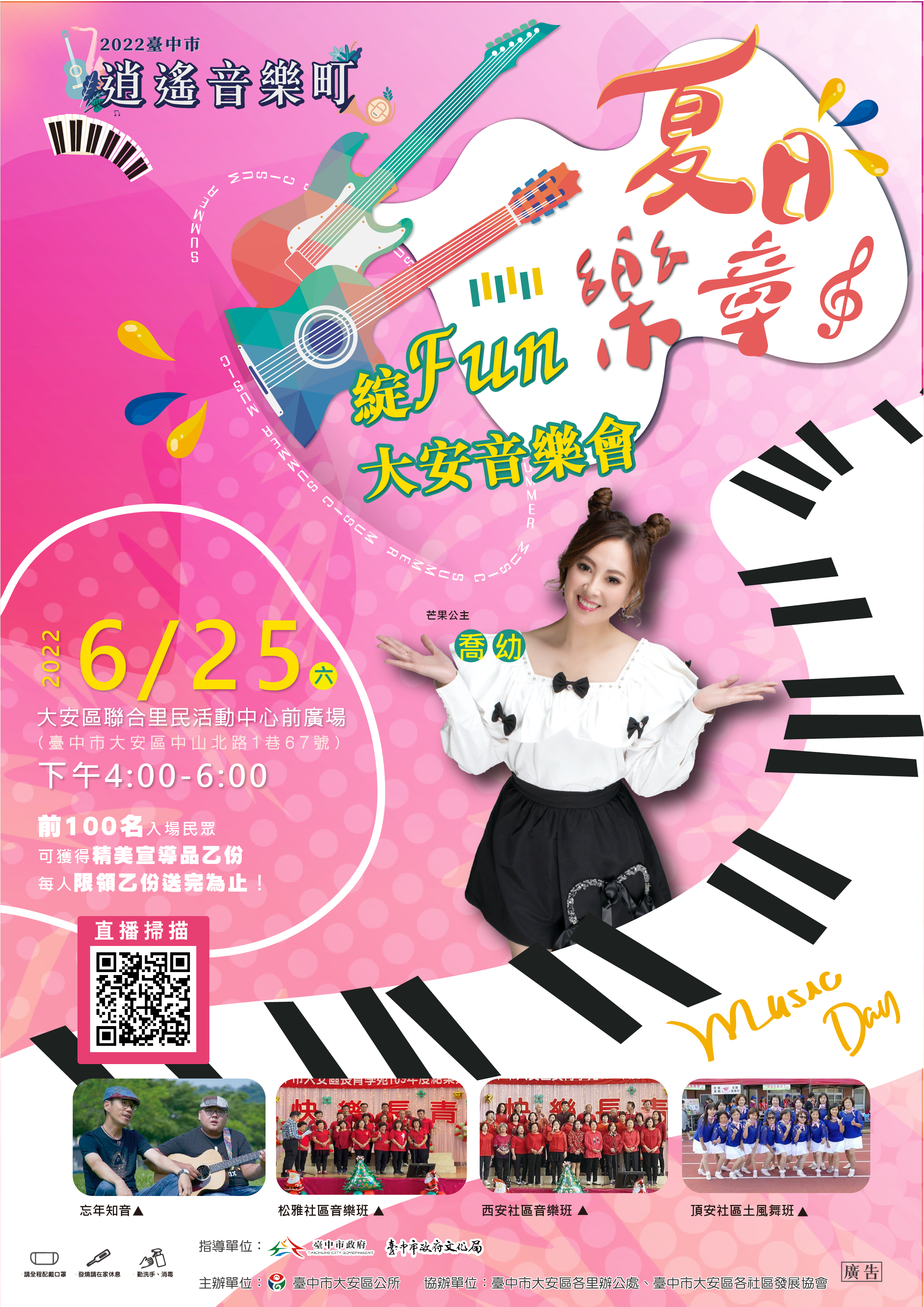 今年夏天最接地氣的「2022台中市逍遙音樂町」,這週五24日及週六25日將在梧棲、東勢、大安及北區一連舉辦四場仲夏音樂會,台中市政府文化局表示,各場次節目皆結合台中市立案演藝團隊、街頭藝人、學校社團及社區團體等在地表演藝術資源,讓台中從海線、山城到市區都有美妙樂音飄揚,歡迎大小朋友一起共度音樂時光。