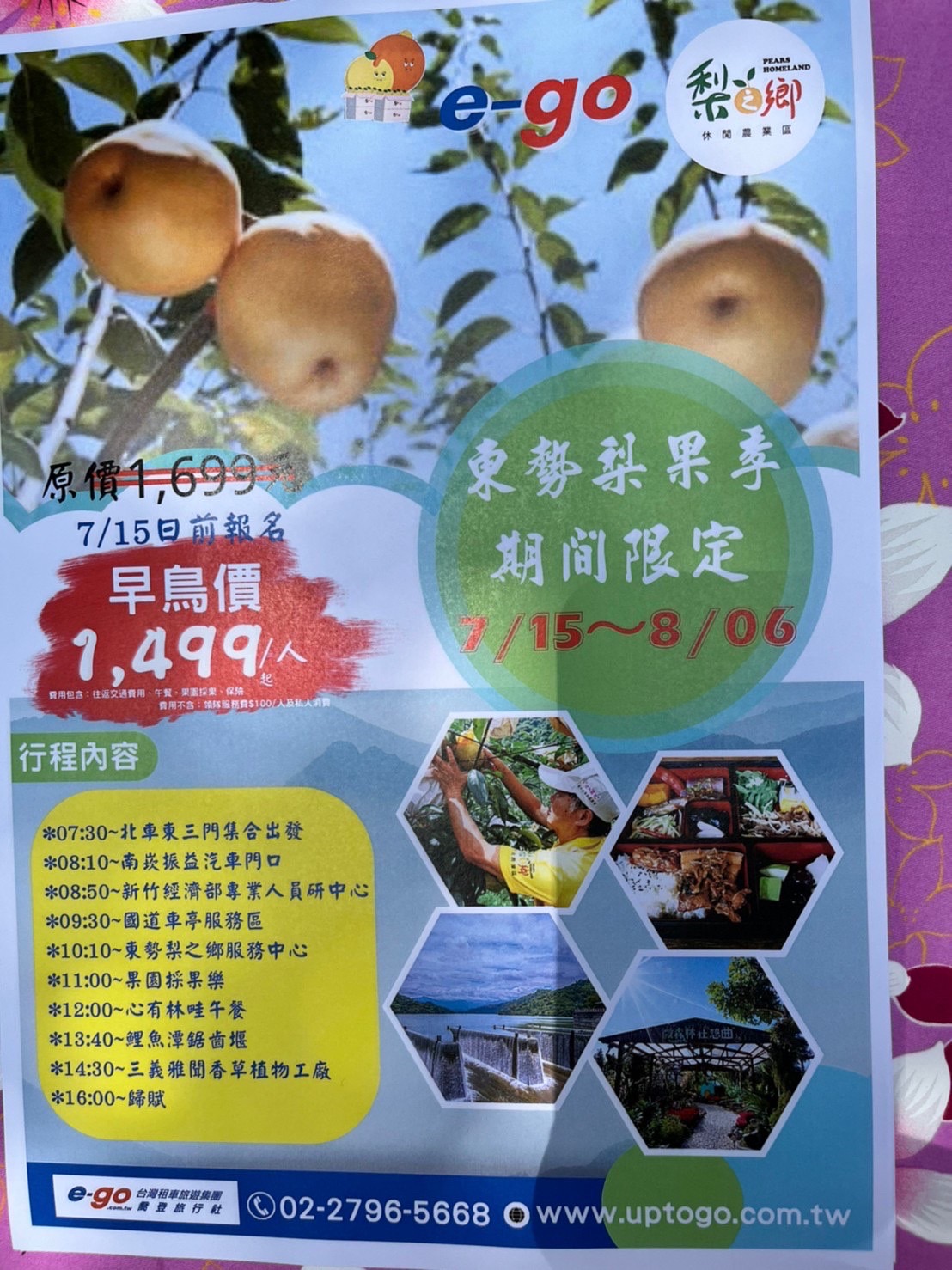 台中市政府農業局與東勢區農會共同輔導梨之鄉休閒農業區與軟埤坑休閒農業區,今(29)日在台北信義微風廣場舉辦「2022夏好梨熟梨饗事成 多吃水梨遠離疫情」媒體發佈會。農業局表示,今年除梨樹認養與採果,特別與e-go台灣租車旅遊集團合作,凡7月15日至8月14日預約台北市雙層餐車晚餐,2人同行即免費贈一精緻水梨禮盒,民眾不必出遠門也能享用東勢最清甜的梨子。