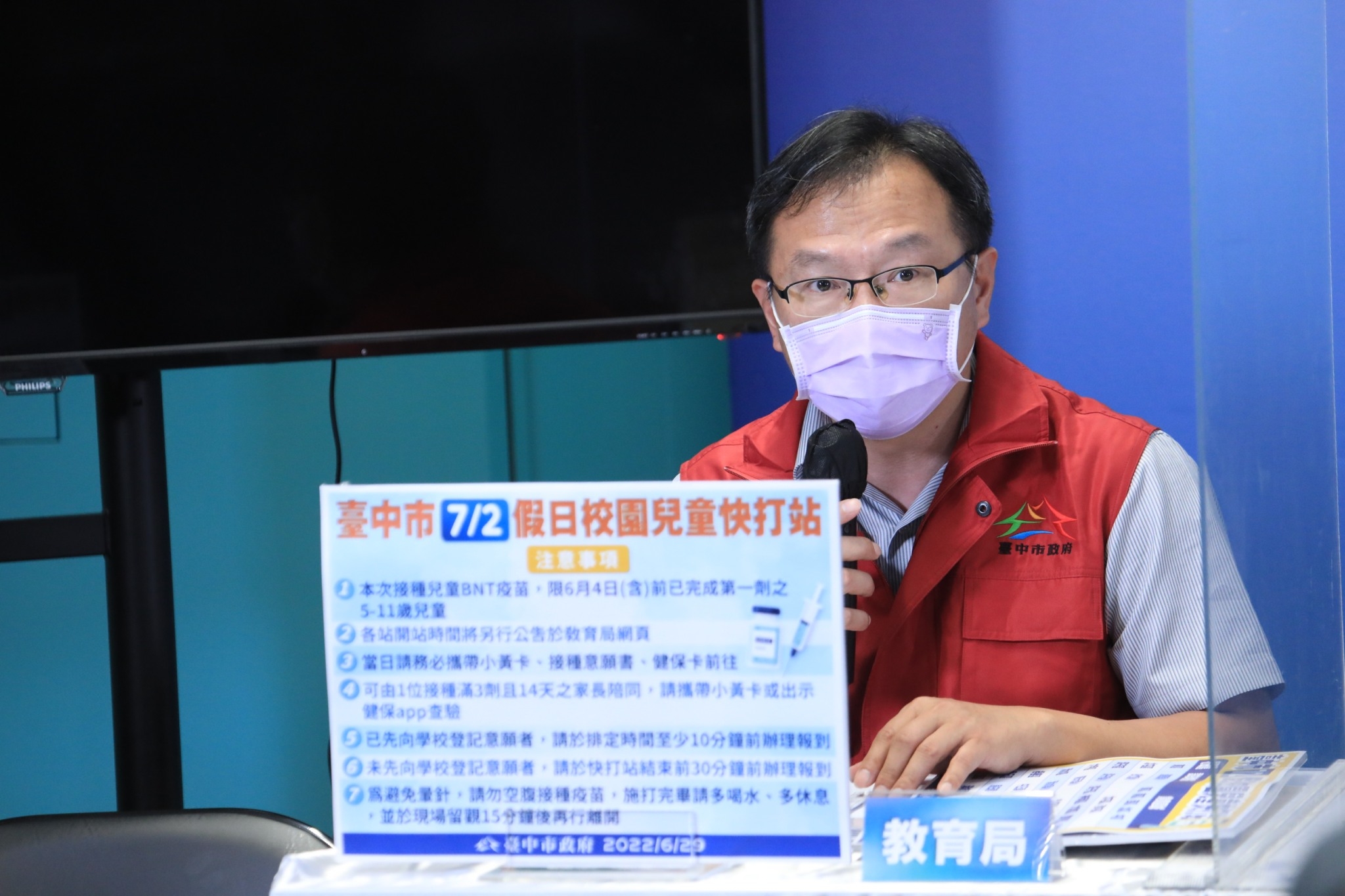 教育局主秘郭明洲表示,目前合約醫療院所、校園集中接種持續進行當中,7月2日開設的假日校園快打站,經統計約有3,204名5-11歲學童有意願至快打站接種疫苗,市府已依行政區域規劃8處快打站。