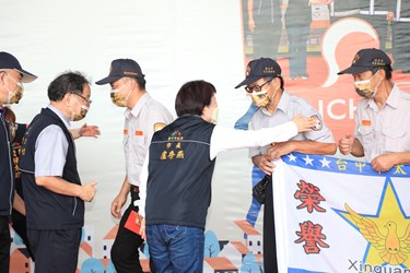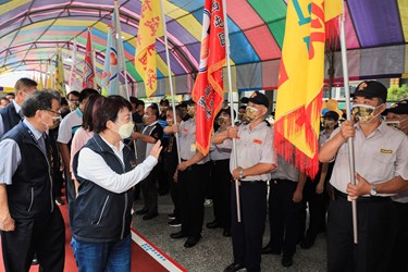 盧市長在民政局長吳世瑋、警察局長蔡蒼柏、新聞局長鄭照新陪同下出席校閱,守望隊員們佩戴市府準備的迷彩口罩,搭配整齊劃一的隊形,展現守望隊員精神抖擻的士氣及守護家園的決心;盧市長除為隊員加油打氣外,也逐一為各里頒贈獎勵品慰勉隊員辛勞。