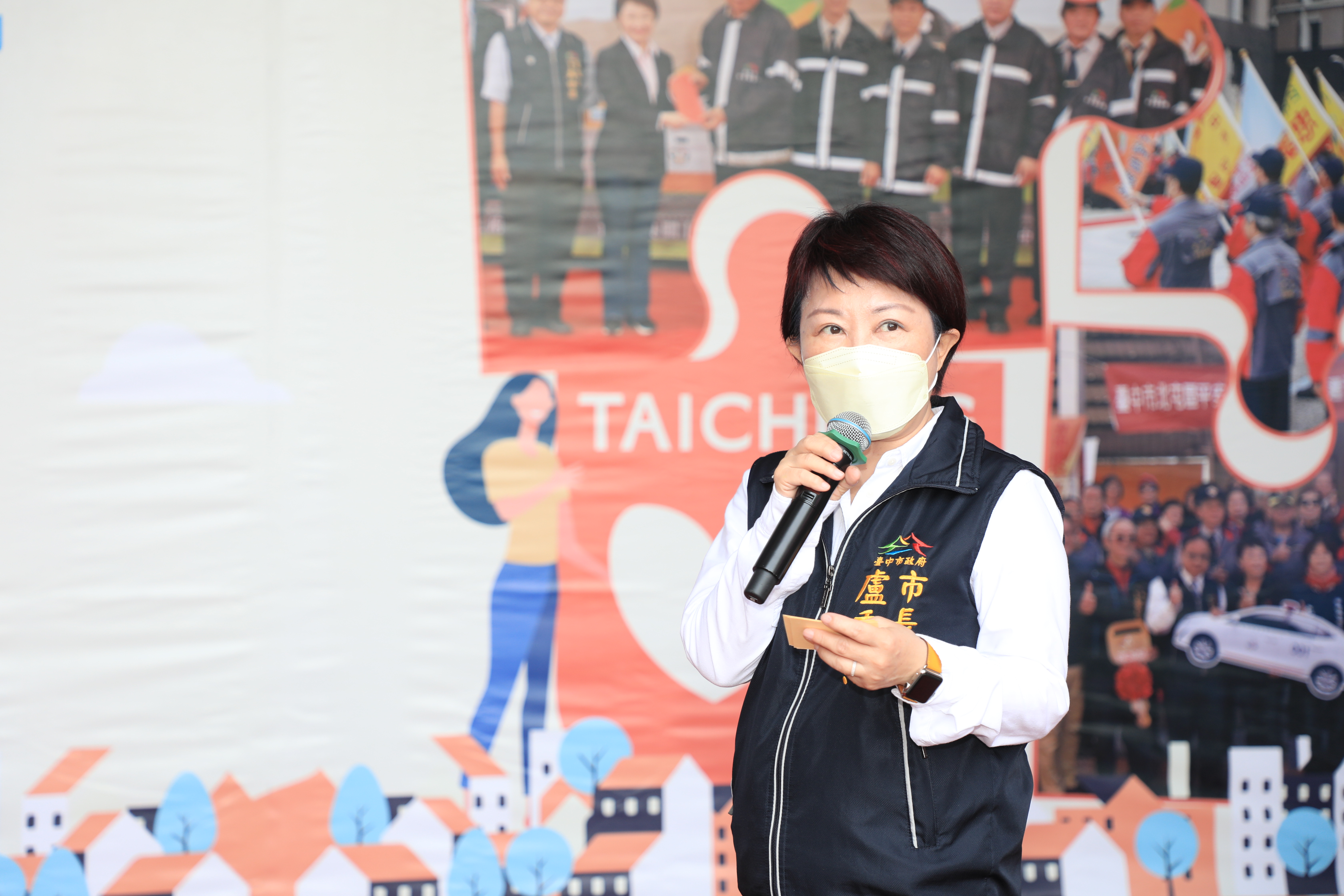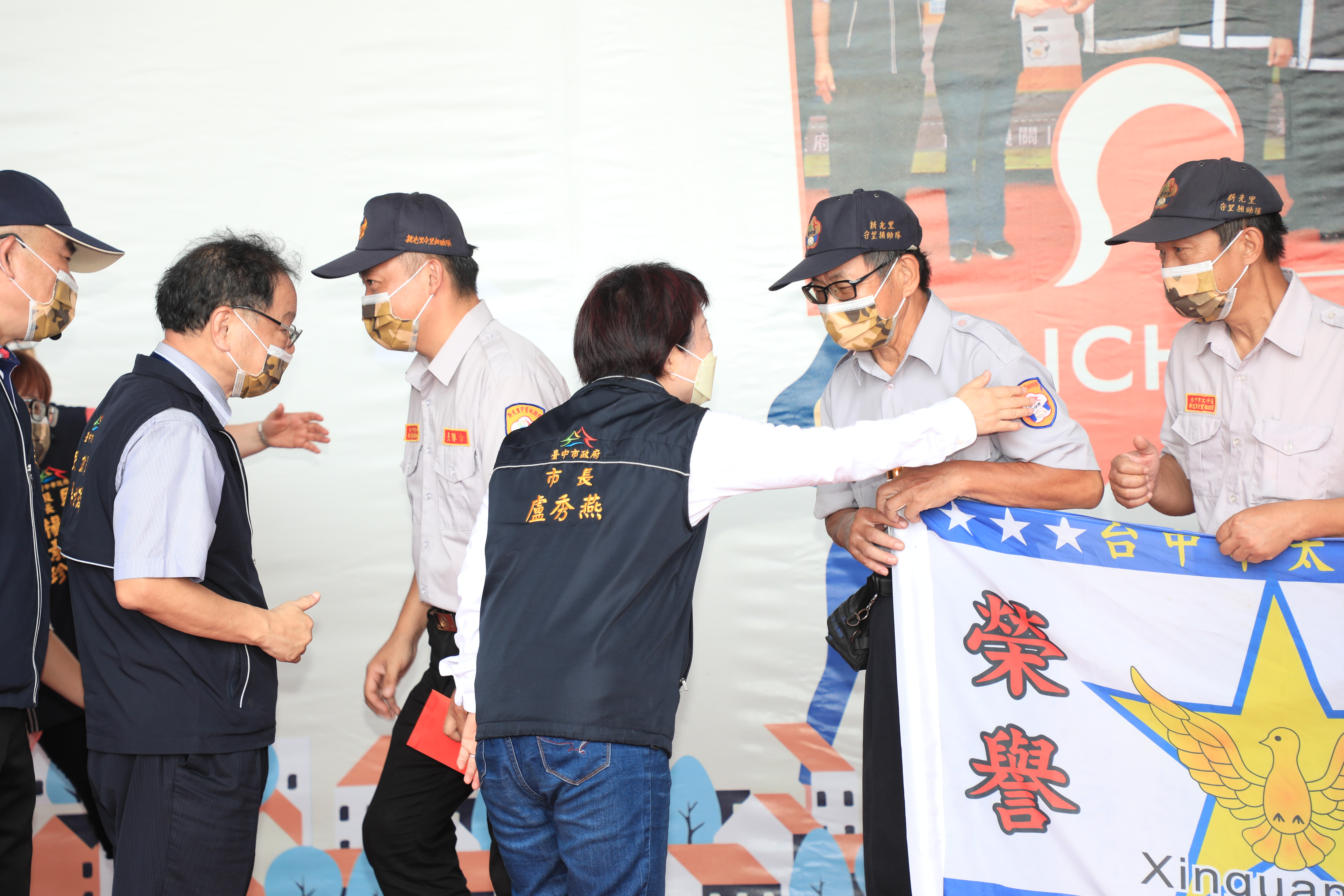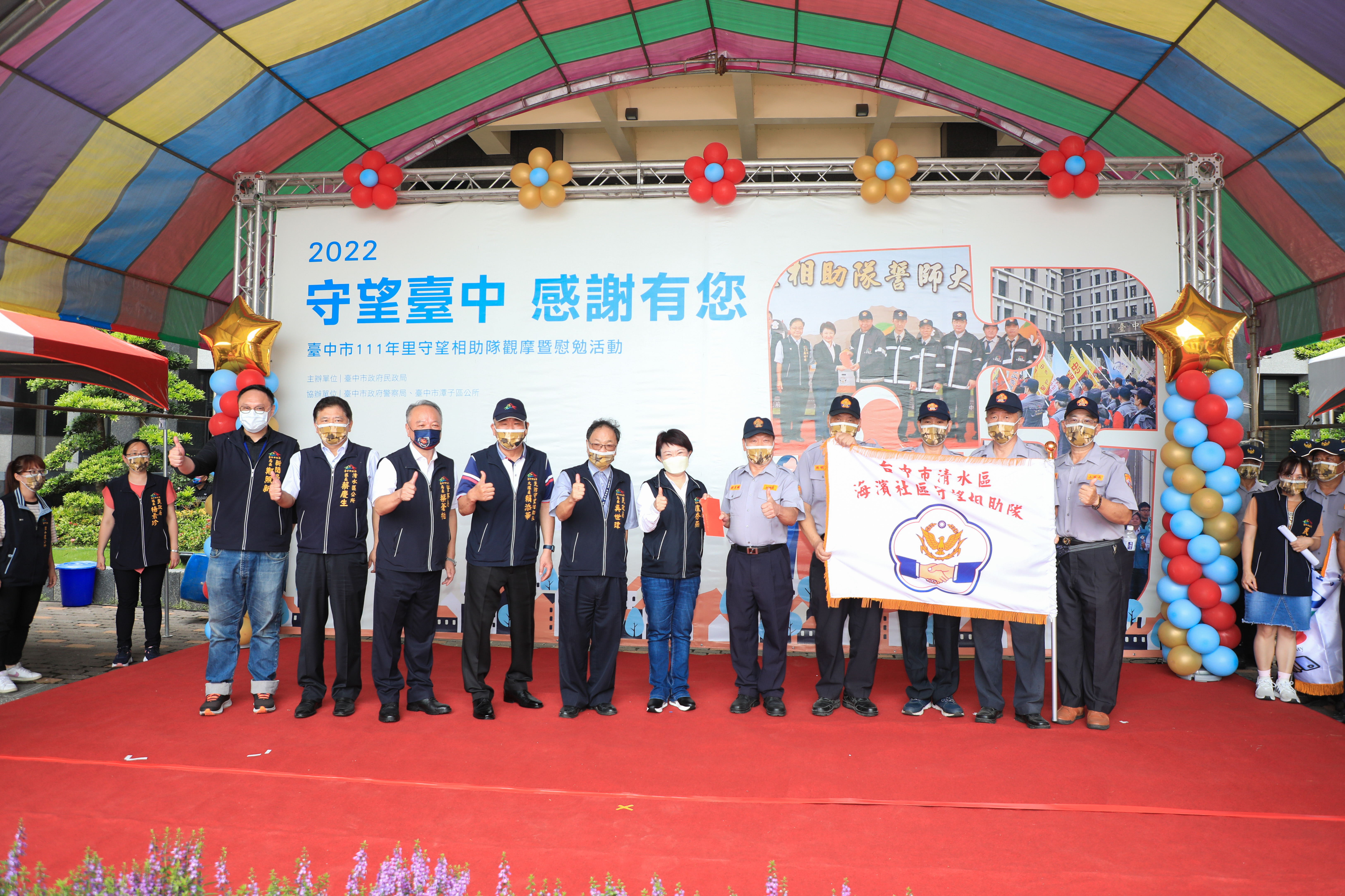 「感謝有你,守護台中!」盧市長表示,今年是艱辛的一年,為了抵禦新冠肺炎疫情入侵,感謝守望相助隊長期站在第一線提供夜間巡守服務,與市府站在同一陣線,更加發揮守望相助的精神,守護市民朋友;今日藉著里守望相助隊誓師的機會,她代表市府及所有市民,感謝所有隊員們經年累月守護鄰里。