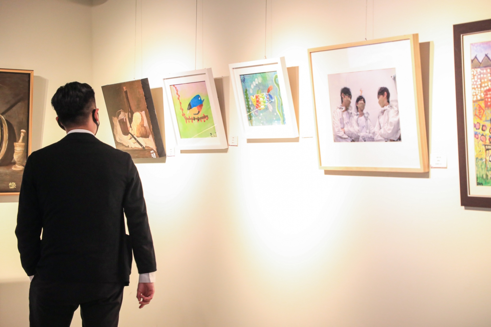 賴老師也分享,她的孩子廖靖凱就讀新光國中,3歲時還沒有口語能力,每天晚上的行程都是早療,但美術老師發現靖凱優異的空間概念、色彩調配能力及活潑的構圖創意,也讓她看見了雙殊孩子優勢能力服務的需要,進而開啟藝才教育的契機。廖靖凱的參展作品〈廚房一隅〉,以高難度罩染方式呈現畫面的光影效果,低調的咖啡古典色彩,表現金屬鍋具和二條魚鱗上的光澤;發亮的白麵包和深棕色的陶器茶壺,更表現出強烈的對比,令人驚豔。