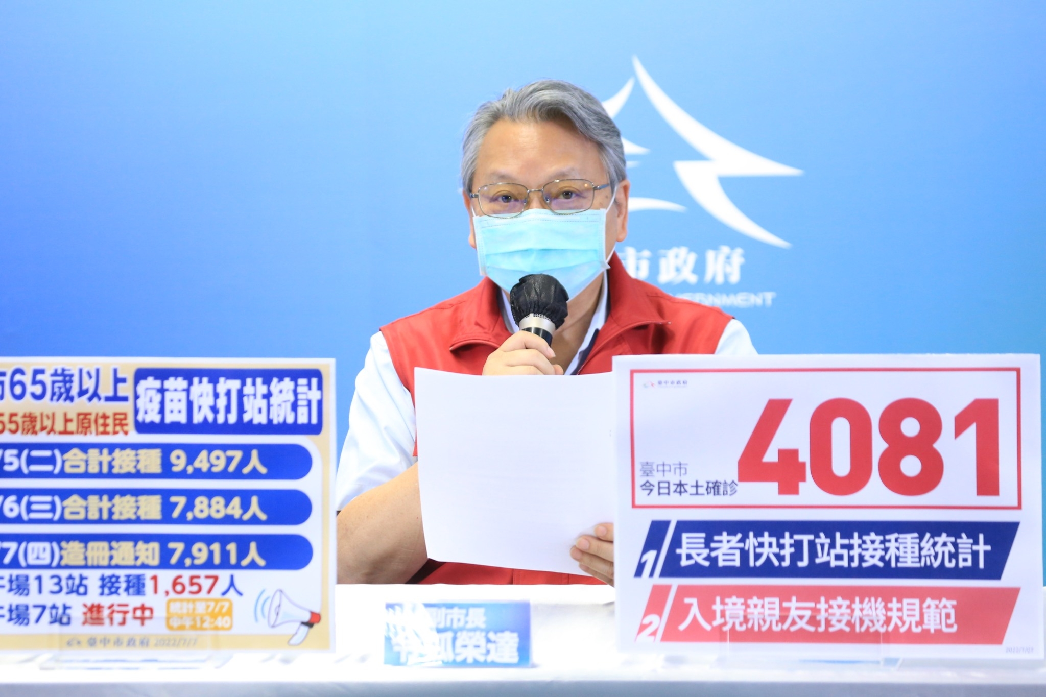 今(7)日全國新增3萬1,364例本土個案,台中市新增4,081例本土個案,其中3913例為快篩陽確診,佔95.88%,相較上週四(6月30日)5639例下降27.63%。副市長令狐榮達今日於疫情記者會表示,中央宣布6個月至5歲莫德納幼兒疫苗最快7月21日配送到各縣市,台中預計7月22日開打,採合約院所、幼兒快打站、衛生所及入園「四管齊下」接種,估計8萬5,540位嬰幼兒符合資格,後續規劃將再對外說明。