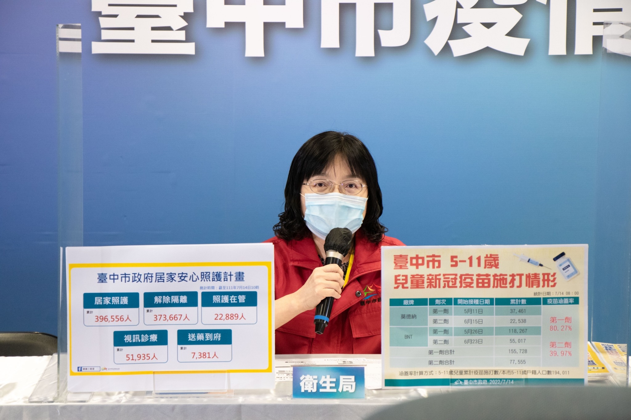 另有關台中市5至11歲兒童疫苗施打情形,令狐副市長表示,統計至昨日止,第一劑共施打15萬5,728人,第一劑疫苗涵蓋率80.27%,第二劑共施打7萬7,555人,第二劑疫苗涵蓋率39.97%,校園集中接種到明日將告一段落,醫療院所則將持續提供兒童疫苗接種服務。