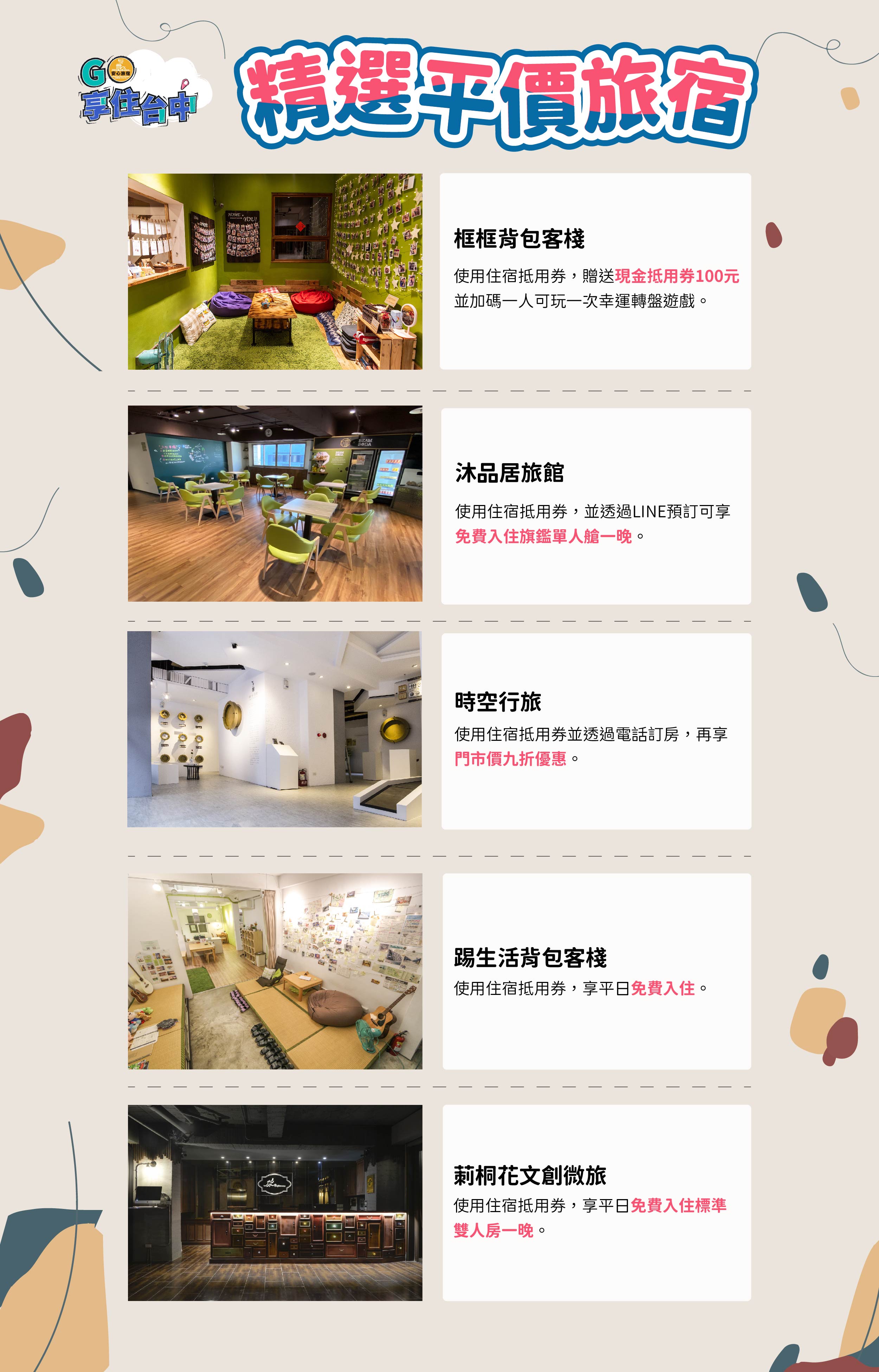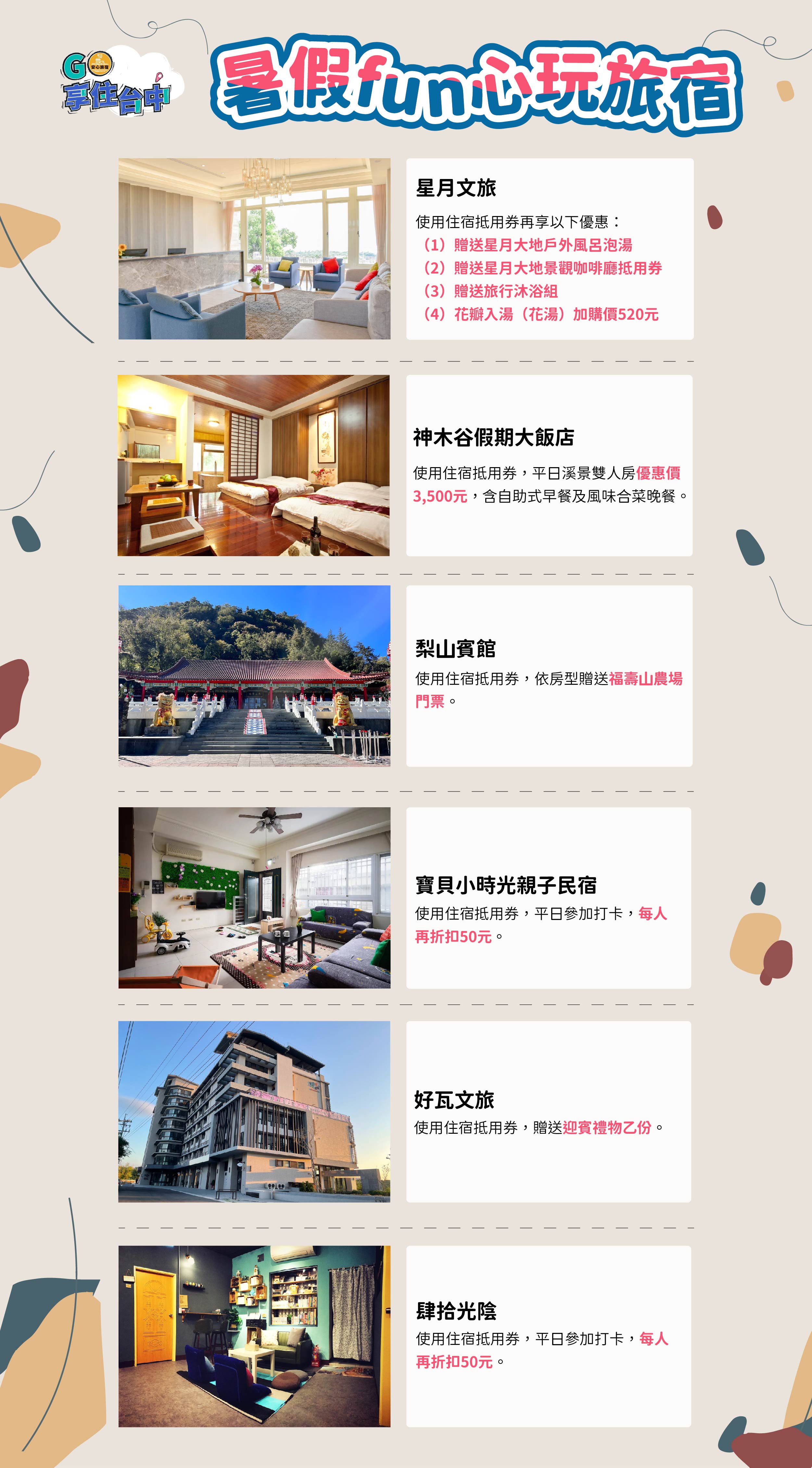 觀旅局說明,今年度推出「GO!享住台中」千元住宿抵用券抽獎,活動搭配逾百家安心旅宿,讓民眾認識更多台中特色主題旅宿,不論是暑假 Fun 心玩、親子友善、精選平價、山海屯都等,都能依主題遊覽各區店家獨家優惠。也呼籲手中仍持有「GO!享住台中」千元住宿抵用券的幸運兒,8月底前搭配中央悠遊國旅補助,即可享有全國最高優惠2,300元折扣,歡迎大小家庭至台中住宿旅遊樂玩一夏,優惠享最多。