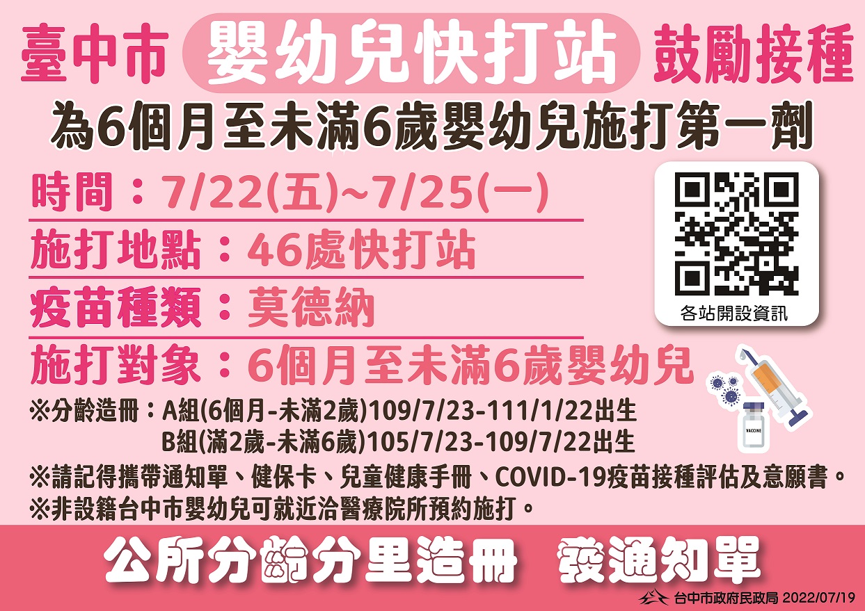 台中市政府繼兒童快打站、長者快打站後,配合中央配撥莫德納疫苗,7月22日至25日將啟動46處嬰幼兒快打站、共215場次,提供6個月以上未滿6歲嬰幼兒接種莫德納疫苗第一劑,另梨山地區施打人數較少,配合當地衛生所疫苗門診,梨山衛生所場次則調整至7月26日施打。民政局長吳世瑋籲請家長踴躍帶家中符合施打年齡的小朋友前往接種,提升嬰幼兒個人防護力。