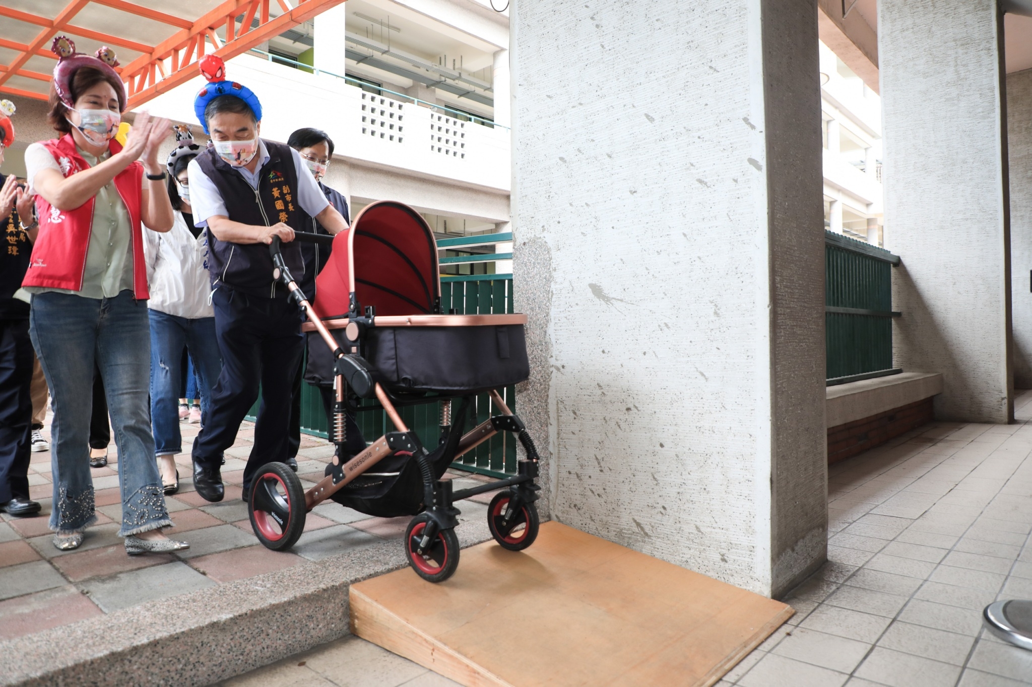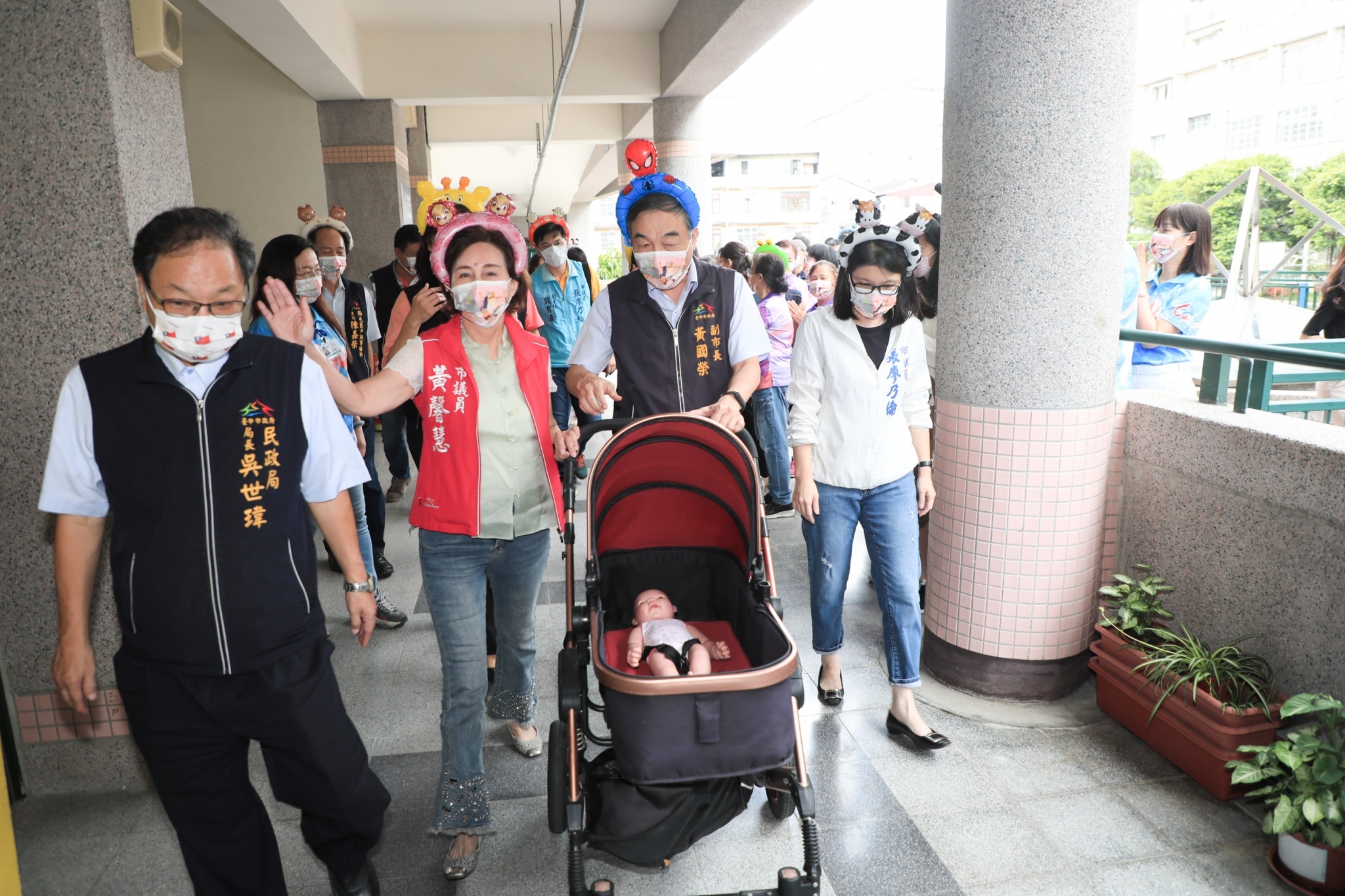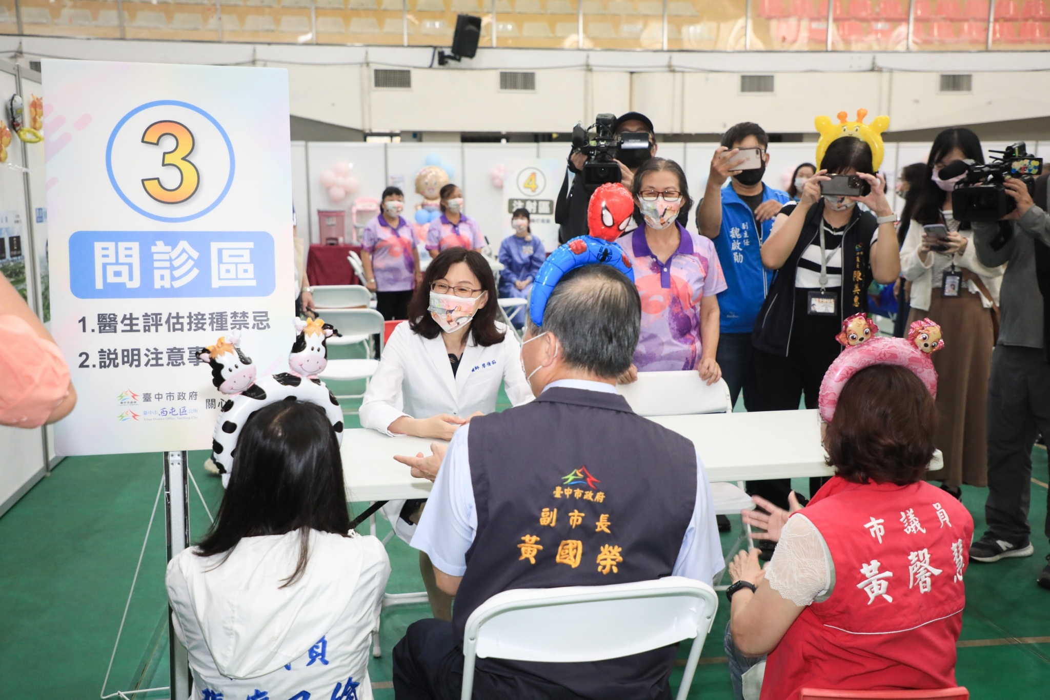 黃副市長今日頭戴蜘蛛人氣球髮箍,化身為超級奶爸,手推嬰兒車,沿著動線模擬爸爸媽媽帶小朋友施打疫苗情形,同時為市民朋友開箱嬰幼兒快打站接種環境,逐一檢視報到區、掛號區、注射區、留觀區等動線規劃,現場不僅加寬、加大走道間距,留觀區也規劃2張座椅併排,預留家長陪同座位。