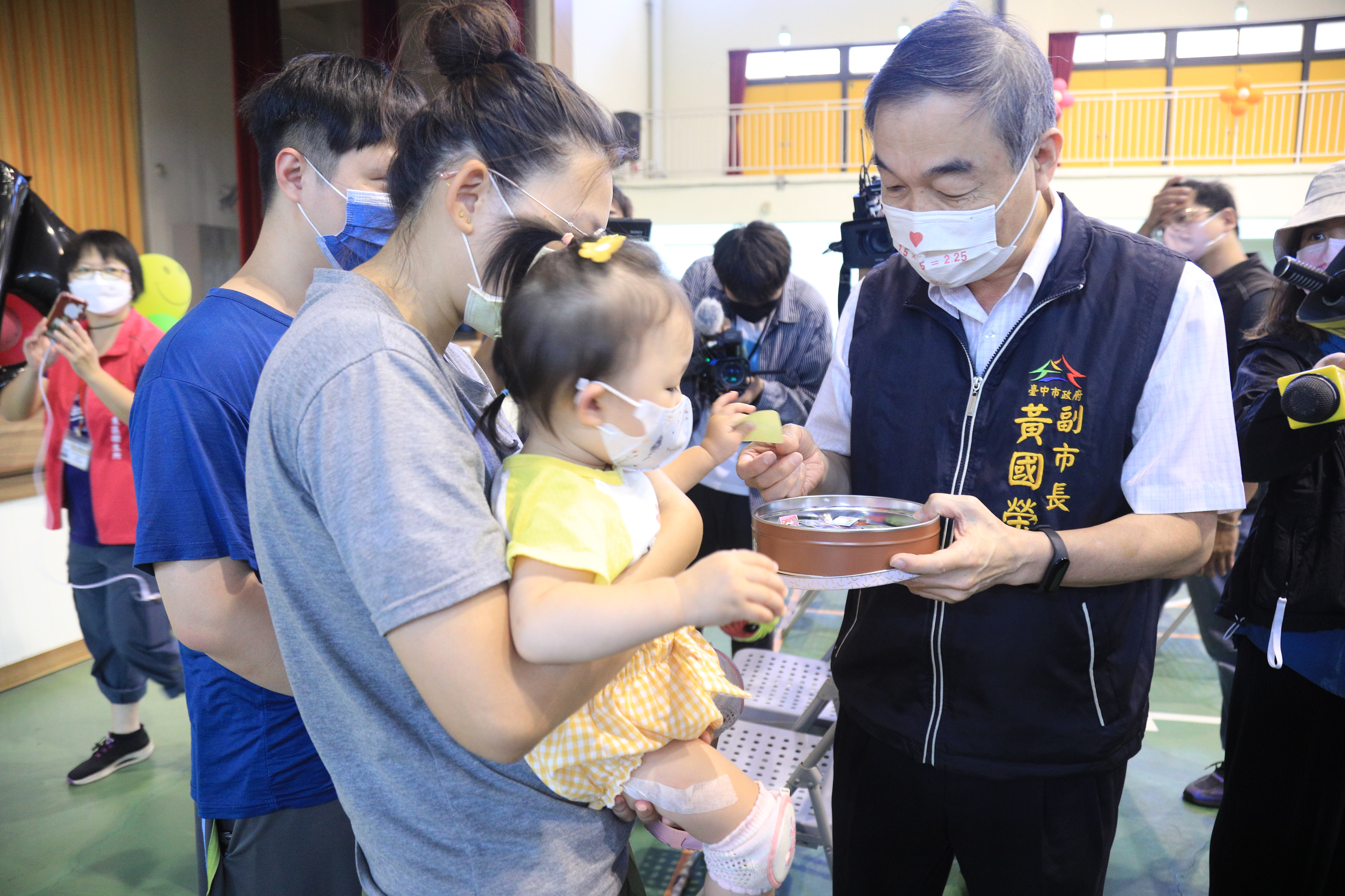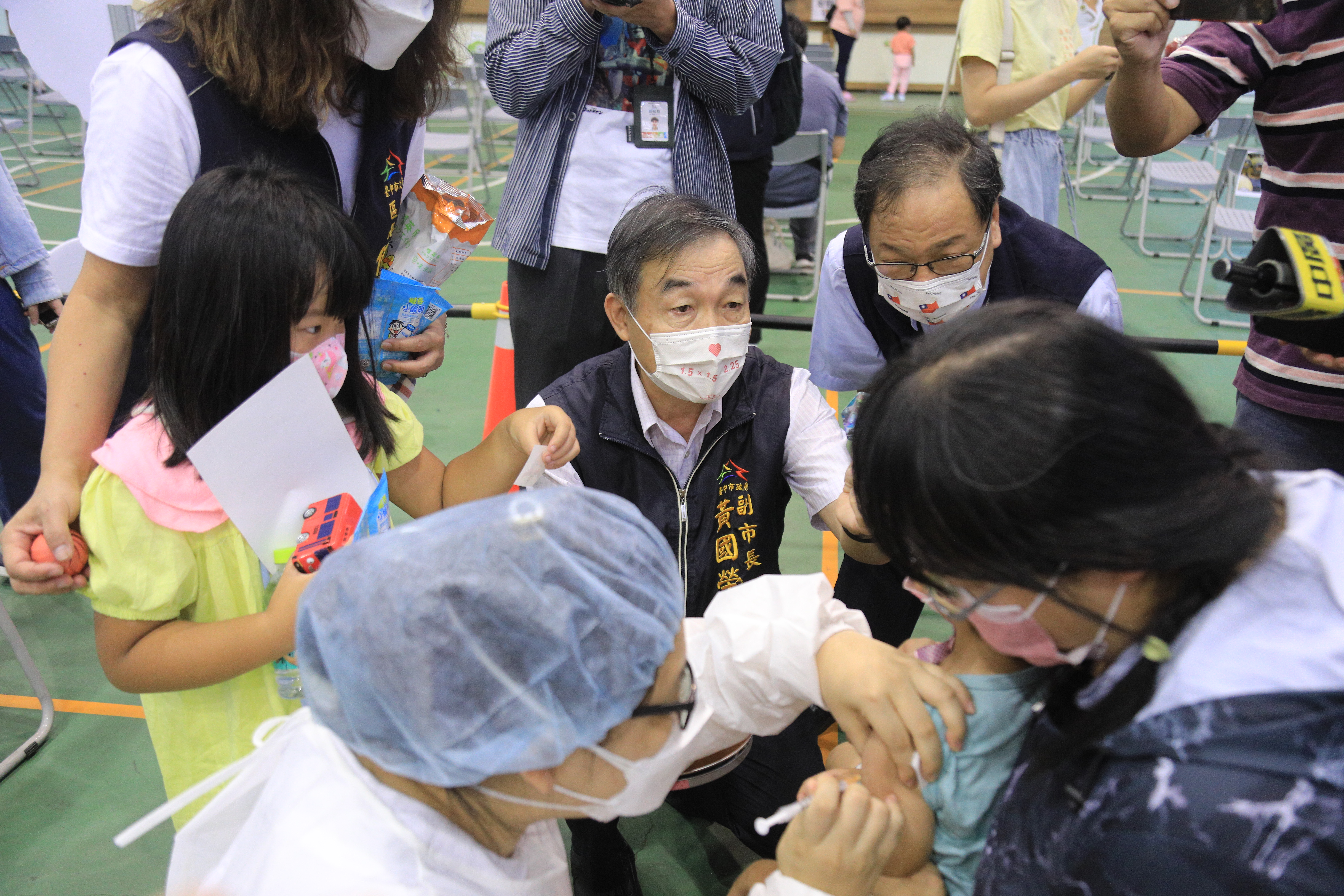 提升嬰幼兒防護力!台中市政府採合約院所、衛生所、幼兒園入園,以及啟動嬰幼兒快打站「多管齊下」,提供6個月以上未滿6歲嬰幼兒接種莫德納疫苗第一劑。今(22)日起連續四天開設46處嬰幼兒快打站為幼童接種,副市長黃國榮前往東區進德國小關心接種情形表示,現場動線安排及各項友善親子措施均準備充分,秩序良好,尤其嬰幼兒注射後,難免哭鬧,現場醫護與工作人員,馬上遞上「琳瑯滿目的玩具和點心」,轉移孩子的注意力,也讓現場家長覺得逗趣。黃副市長表示,感謝工作人員辛勞,也呼籲家長帶小朋友來施打,提升防護力。