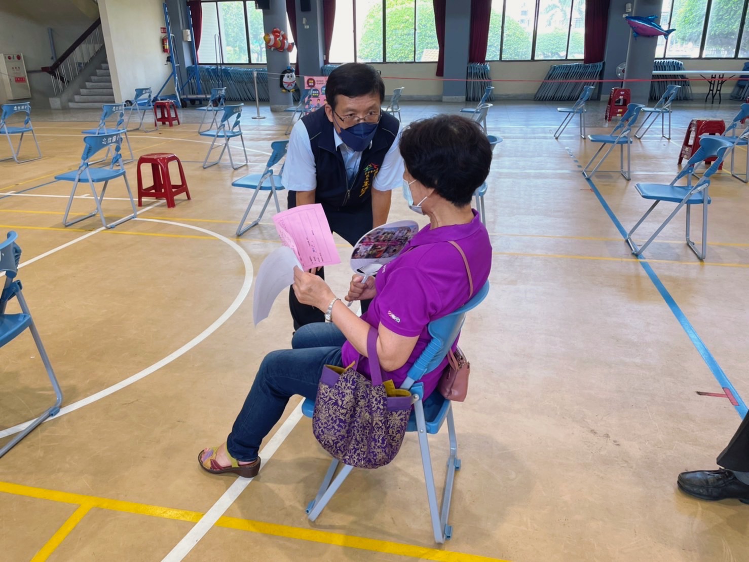 西區區長王瑞嘉指出,今天快打站施打對象為設籍台中市65歲以上長者、55歲以上原住民接種第4劑苗德納疫苗(第2次追加劑),動線循往例在入口處測量體溫,有專人引導填寫意願書等,今天較特別的是還會致贈扇子,雖場地寬敞也有充足冷氣,但致贈扇子可讓長者感到更舒適及貼心。