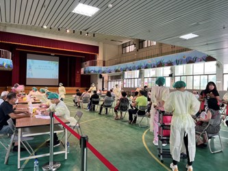 王區長也說,市府依市長盧秀燕的指示,照顧所有長輩且做好貼心服務,讓長輩放心、安心、寬心。此次施打疫苗流程採取宇美町式施打法,此施打法為長輩在位子上由醫生問診,確定健康狀況良好即由護士施打疫苗,前後不超過一分鐘,兼具安全、迅速及便利,長輩接種完成在座位上休息後,確定身體無不適,即可領取500元禮券及2劑快篩劑,讓長輩帶者滿意笑容施打疫苗,提升防護力。