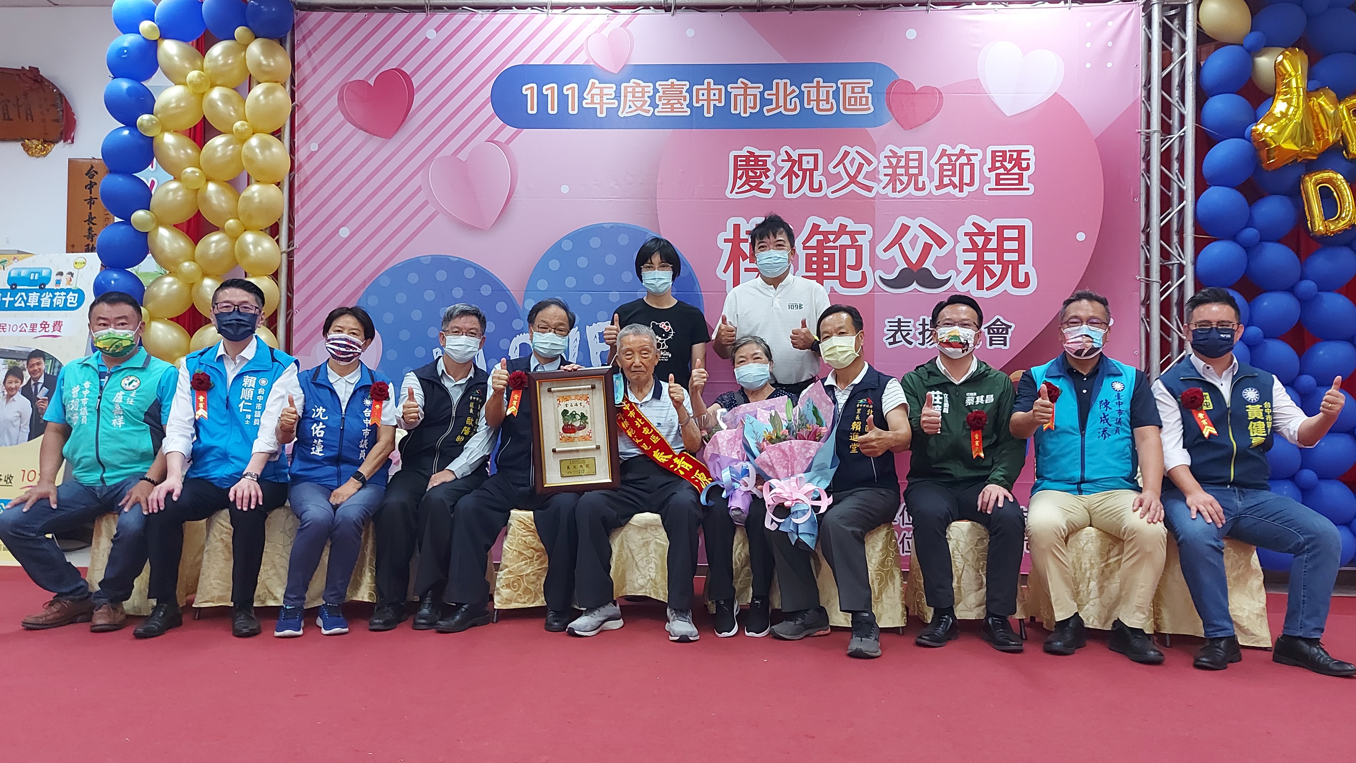 台中市北屯區公所今(31)日舉辦「111年度模範父親表揚活動」,邀請區內受表揚的52位模範父親一起提前慶祝父親節。台中市政府民政局長吳世瑋代表市長盧秀燕頒贈「良父典範」獎牌,並獻上最真摯的感謝與祝福,預祝所有爸爸們父親節快樂,家庭美滿幸福。