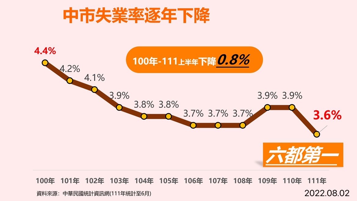 另外,經濟部最新公布的「109年工廠校正及營運報告」也顯示,工廠在疫情最嚴峻的109年仍看好台中前景,投資在設備、廠房等固定資產投資額高達2,847億元。這些企業的穩定投資,持續提供台中豐沛就業機會,也讓失業率不斷下降,在111年上半年一舉拿下3.6%六都最低的好成績。