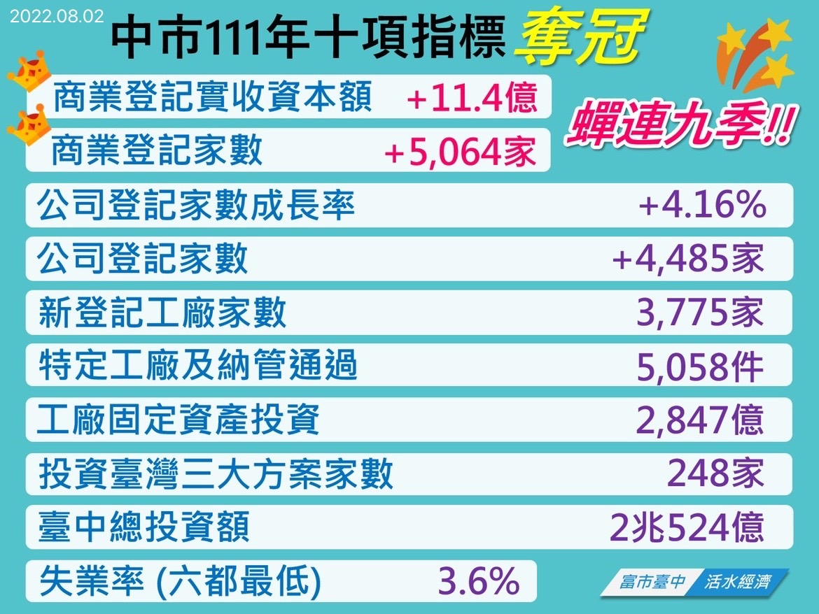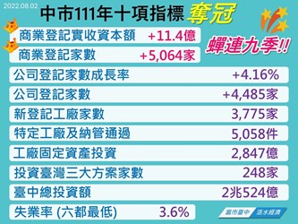 今日線上市政會議,由經發局長張峯源以「十項經濟指標全國第一 持續提升市民所得」為題進行專案報告。張局長表示,根據中央近期公布的多項統計數據,台中已累計10項指標奪冠,其中商業登記家數、實收資本額成長數2項指標更蟬聯9季全國第一,回顧歷次經濟指標奪冠成績,台中自110年第1季以來,已創下連續6季超過6項指標奪冠的輝煌紀錄,投資額加計台積電兆元投資,也正式衝破2兆元大關。