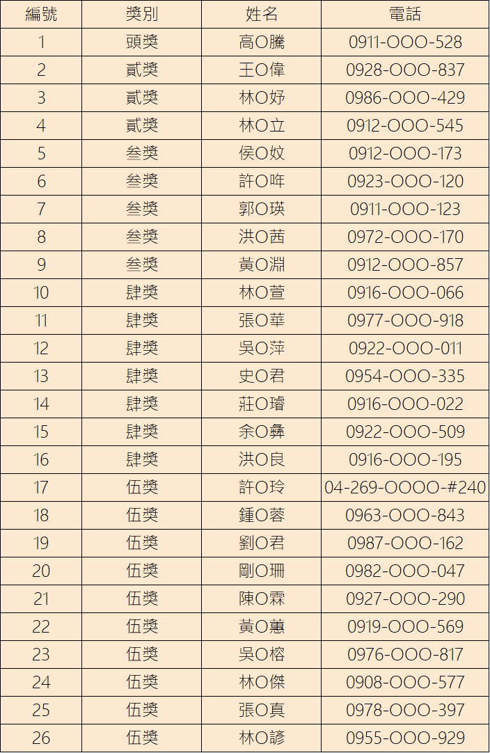 政風處表示,活動結果已由政風處副處長許金來抽出26名幸運兒,其中最大獎項為1萬元全聯福利中心禮券,另外也有許多豐富又實用的好禮。政風處會再聯繫得獎者,也請得獎者提供核對身分的資料,經審核無誤後,即可領取獎項,得獎名單已公布於活動網站( https://www.siang-yu.com/ethicsQuiz/ )及政風處網頁( https://www.ethics.taichung.gov.tw/ )。(8/4*6)*政風處