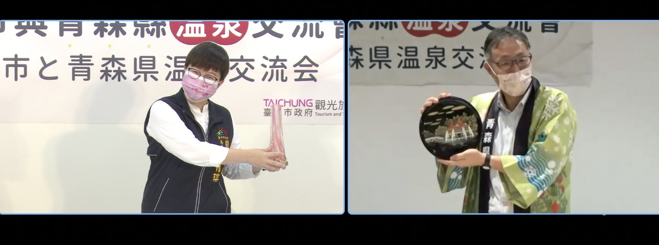 昨日交流會邀請台中市溫泉觀光協會、台中市和平區谷關社區發展協會及溫泉業者,與日本青森縣觀光國際戰略局、平川市政府、青森縣溫泉協議會及青森縣溫泉業者等政府機關及溫泉業者進行視訊交流;會後由韓局長與日本青森縣觀光國際戰略局長堀義明進行紀念品致贈儀式,代表雙方深厚的友誼長存,共同為疫後城市觀光與溫泉產業交流而努力。