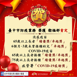 台中市昨(17)日在全國防疫會議中獲頒流感疫苗及新冠疫苗接種8大績優獎項,包括110年流感疫苗「65歲以上長者」接種績優獎(全國第一)及卓越獎(全國唯一)、「6個月至3歲未曾接種幼兒」接種績優獎;新冠疫苗「65歲以上長者接種」績優獎及卓越獎、「75歲以上長者接種」績優獎及卓越獎,以及「COVID-19感謝獎」。台中市政府表示,特別感謝全市醫護、公衛人員的付出和市民伸出手臂接種疫苗,共挺防疫。
