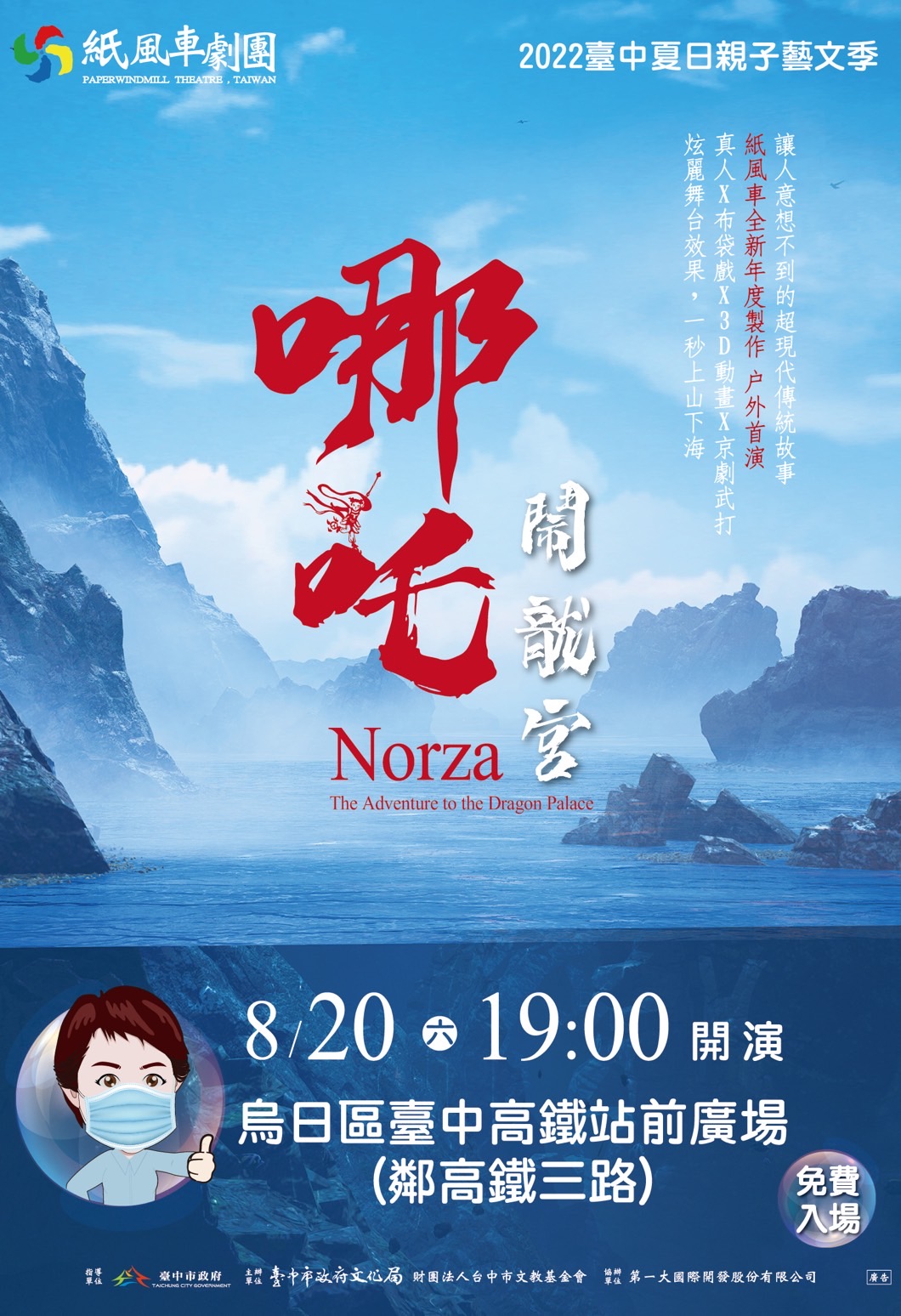 文化局表示,紙風車劇團創團30周年大作《哪吒鬧龍宮》,取材自奇幻小說《封神榜》,彙集台灣布袋戲、廟會身段與北管音樂等傳統元素,結合紙風車30年的演出經驗與年輕世代思維創意,自3月劇場首演後,大受好評,迴響不斷。今晚表演將利用燈光與3D動畫及音效,打造出宛如真實的東海龍宮海底,讓台中市民在仲夏夜,享受沉浸式劇場呈現的文化感官新感覺。