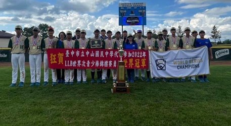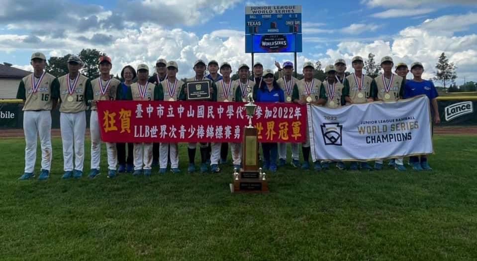 代表台灣出征的台中市中山國中棒球隊,今(22)日凌晨在LLB世界次青少棒總冠軍賽,以7比1戰勝美國組冠軍西南區德州隊,勇奪世界冠軍!教育局指出,中山小將前一場以11比0擊敗捷克隊,贏得國際組冠軍,今日全場敲出10支安打,投手方紹齊更是主投7局,送出6次三振,且全隊守備表現優異,展現中山棒球隊「堅持夢想、永不放棄」精神,順利取得LLB次青少棒錦標賽世界冠軍榮耀,締造中山國中隊史第三冠紀錄。