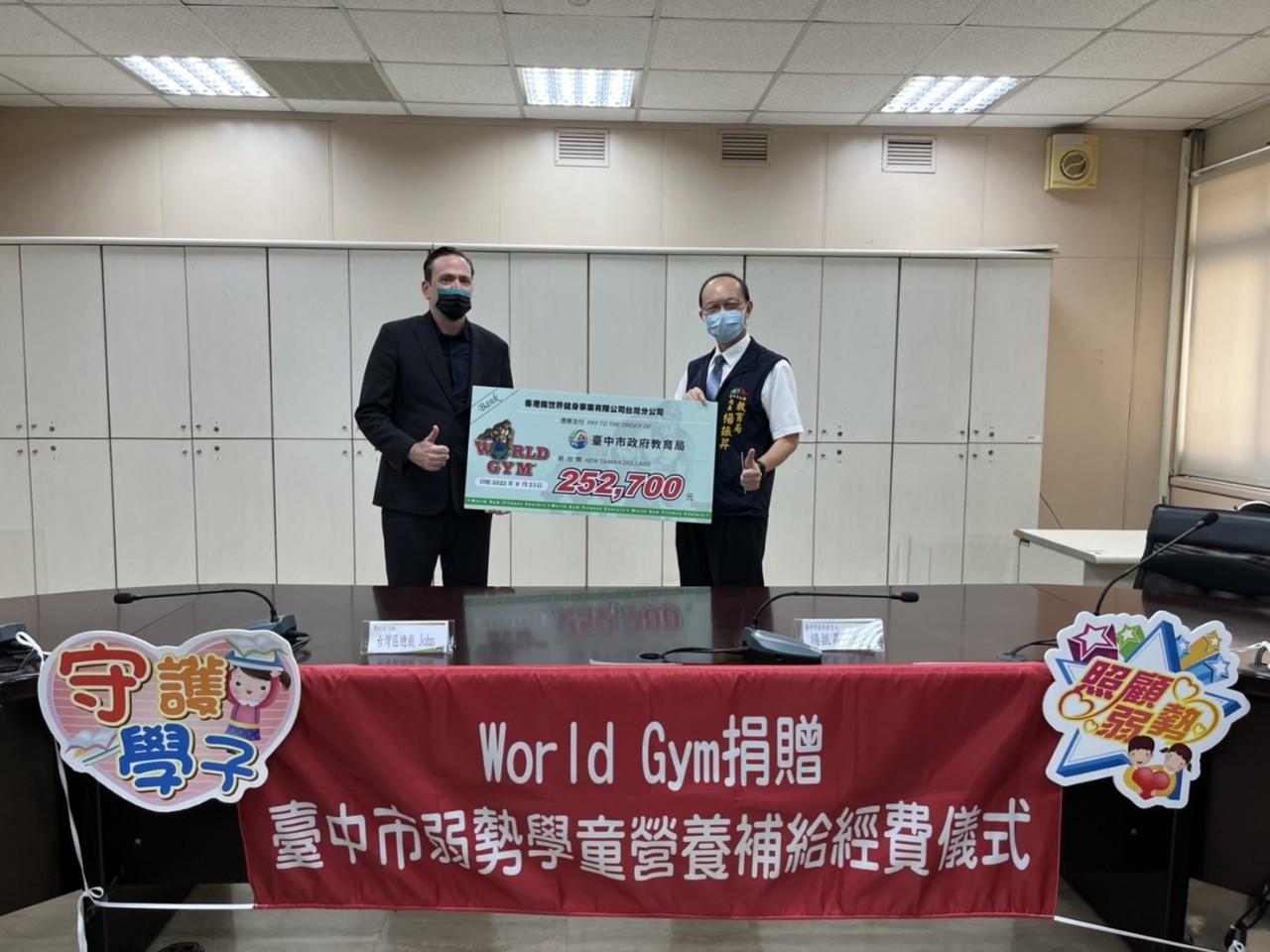 World Gym世界健身俱樂部在今年全台各分店執行「變身大作戰」企劃,鼓勵會員參加「減重健康捐」賽後公益捐款活動,共捐出25萬2,700元,將作為台中市弱勢學童營養午餐補助,今(23)日在台中市政府舉辦捐贈儀式,教育局長楊振昇代表市長盧秀燕受贈,感謝World Gym在疫情仍嚴峻的情況下,為弱勢學生貢獻一己之力。
