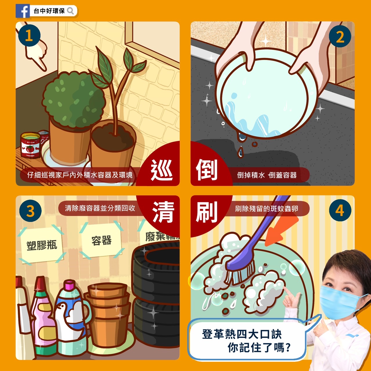 環保局說明,鼓勵市民朋友相揪加入滅孓行列,加強「巡」視住家周遭環境,如陽台、頂樓、防火巷、地下室等,避免積水;「倒」掉積水容器,如水桶、盆栽底盤、帆布、廢輪胎等,並將不用的容器倒置;廢棄容器「清」除回收;「刷」洗容器避免蟲卵附著,保證蚊子不來擾,有效防止登革熱。