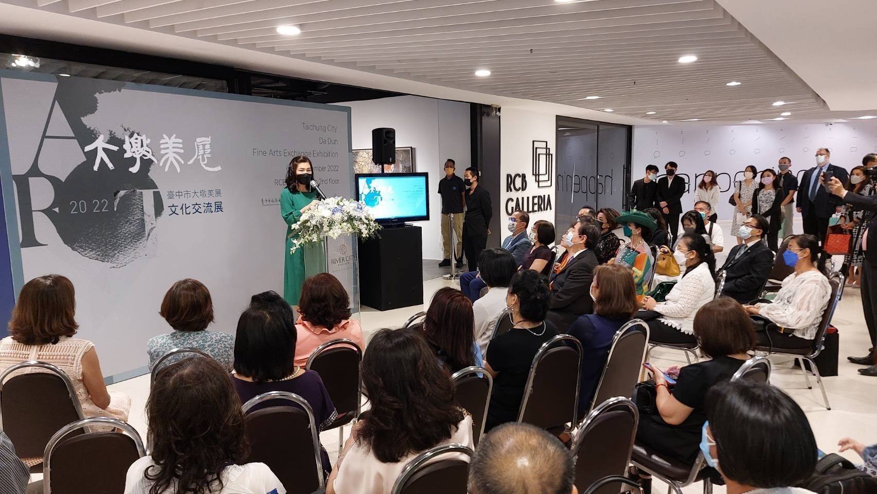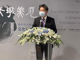 睽違3年,「台中市大墩美展文化交流展」昨(6)日在泰國曼谷河城藝術中心隆重開幕,共精選60件歷屆大墩美展「大墩獎」獲獎傑作前往展出。台中市長盧秀燕特別透過影片感謝駐泰國台北經濟文化辦事處、曼谷河城藝術中心、泰國台灣會館等單位的鼎力協助與全力支持,讓這次展覽得以克服疫情順利策辦。