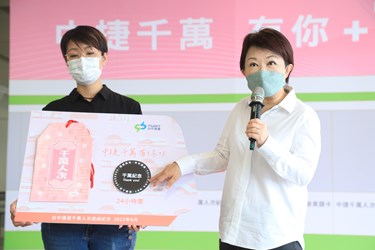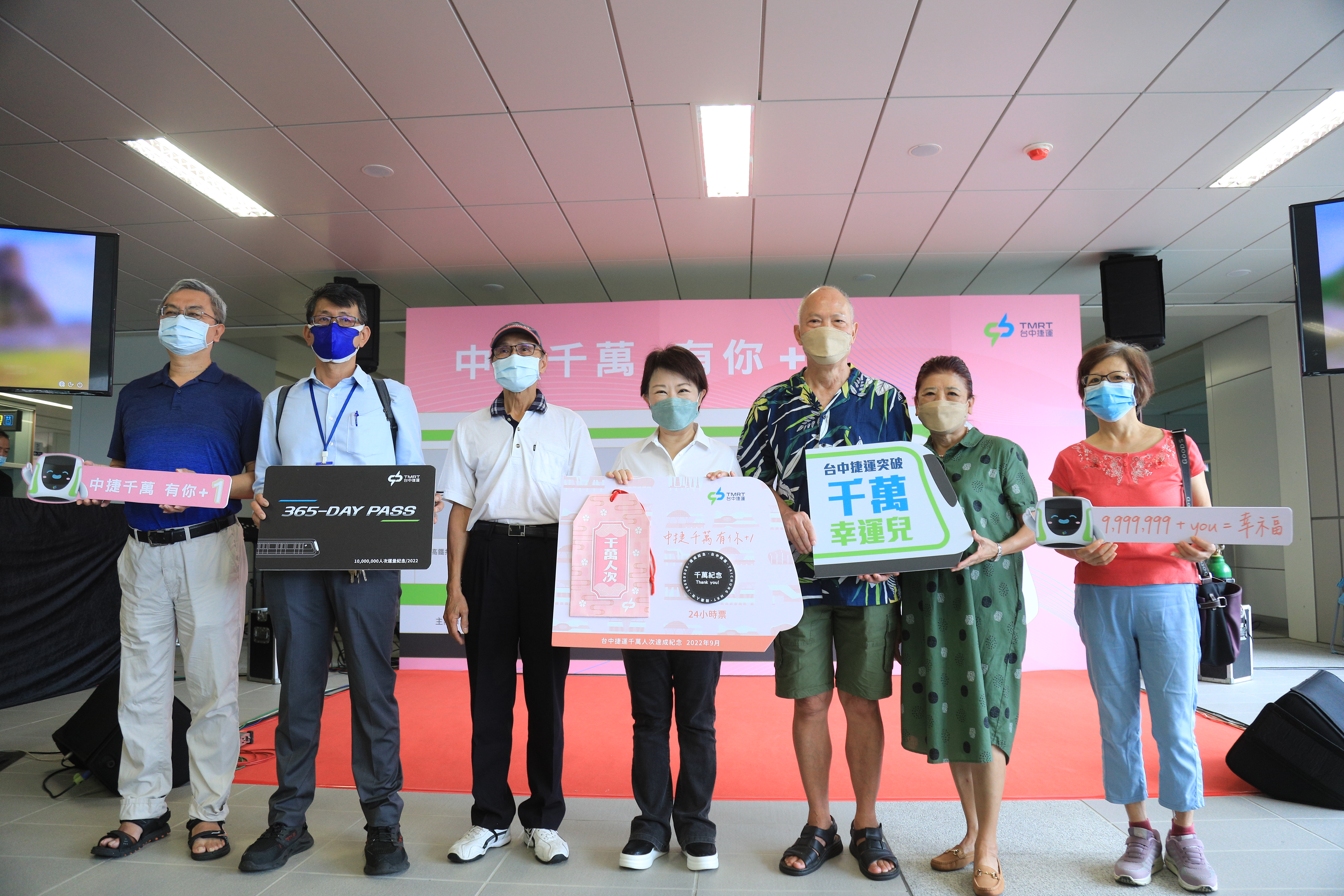 台中捷運跨越新的里程碑,9月9日突破千萬人次,今(12)日邀請通車至今搭乘前幾名的忠實乘客及突破千萬人次幸運兒,分別致贈台灣高鐵來回車票及最尊榮的365天無限搭乘黑鑽卡,現場並首播台中捷運主題MV「家」;市長盧秀燕出席宣布推出千萬人次限量紀念Token,並許下心願,期許中捷綠線擴大營運,節能減碳、改善交通,也希望中央儘速核定捷運藍線,盼早日開工、完工,實現捷運台中。