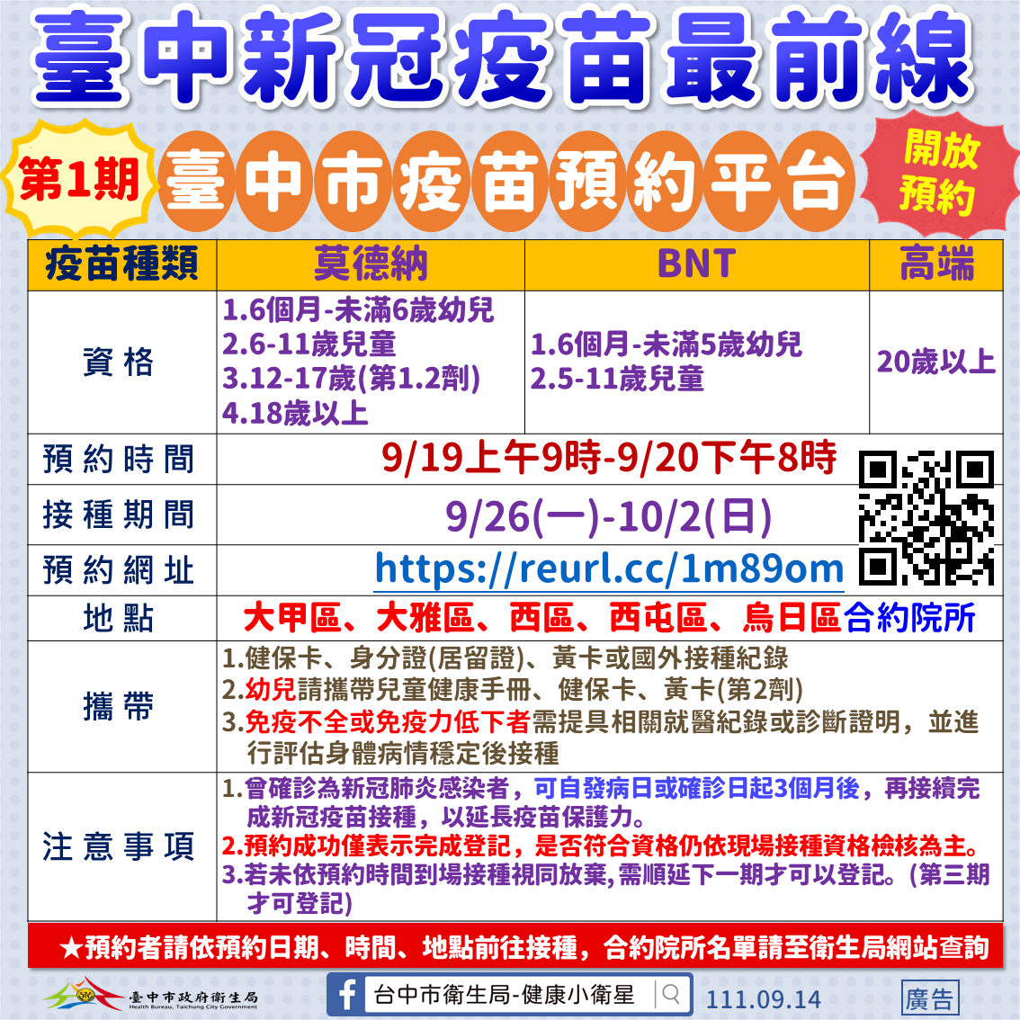 曾局長說明,第1期疫苗平台可預約接種日期為9月26日至10月2日,採部分區域試辦,開放預約接種區域有大甲區、大雅區、西區、西屯區及烏日區等五區,計72家,約可提供210個診次,之後會逐步開放全市合約醫療院所。