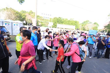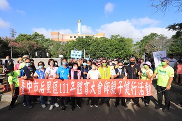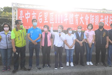 台中市后里區體育會今(25)日於后里游泳池旁籃球場辦理「111年體育大會師親子健行活動」,吸引約2千市民和親子家庭踴躍參加,市長盧秀燕到場表示,台中疫情逐漸減緩,鼓勵市民走出戶外、促進健康,也提醒大家還是不可掉以輕心,台中是酷城市,要酷運動、酷健康。