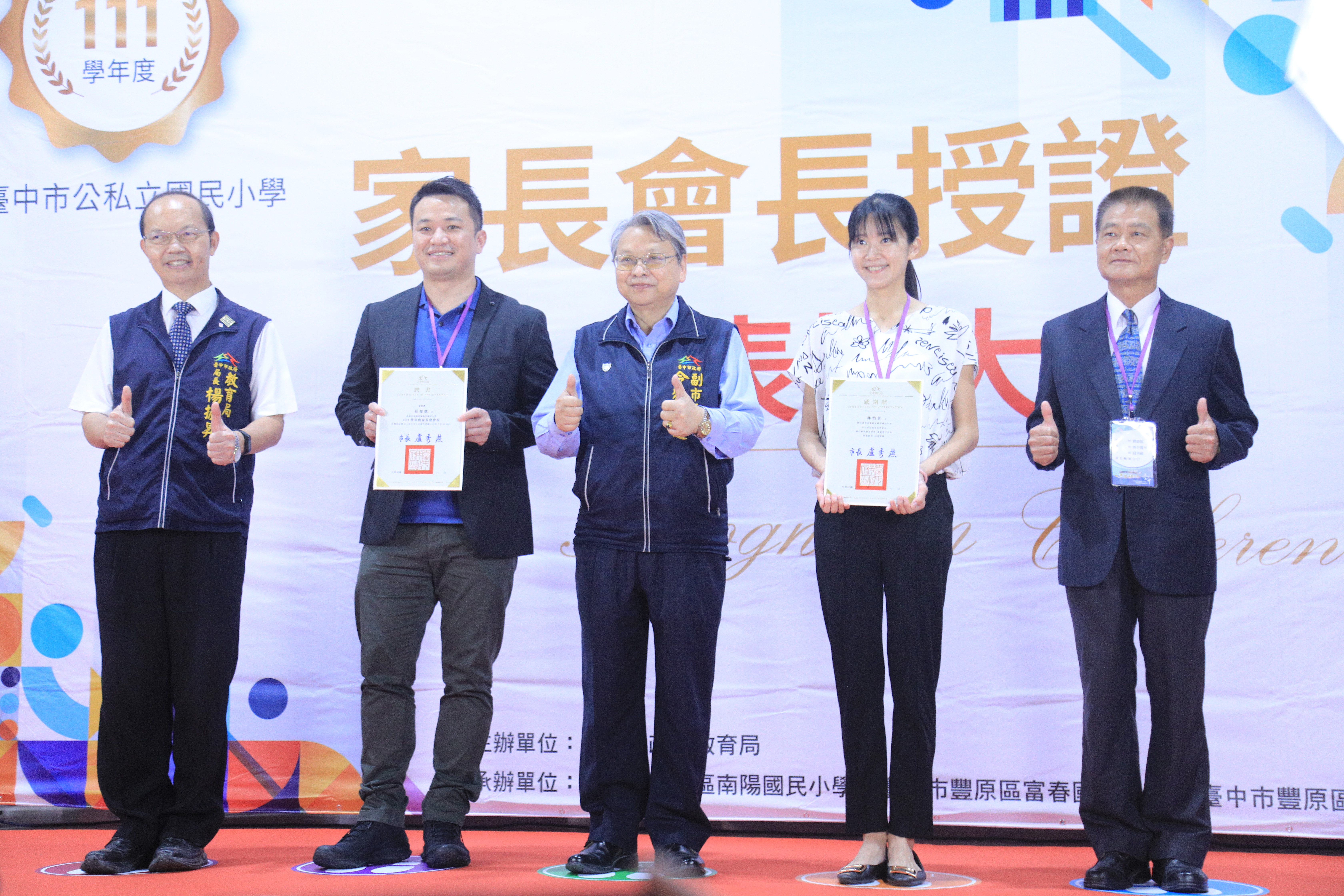 令狐副市長也說,為維護校舍安全,市府持續盤點需整建的老舊校舍,並全力支持實施「老舊校舍整建計畫」及「校舍耐震能力改善計畫」,提供師生最優質的教學環境,市府會持續努力提供學生好學校、好環境、好師資和好課程。今日授證活動,令狐副市長、教育局長楊振昇、多位校長、家長會長及家長團體均共襄盛舉。(11/11*7)*教育局