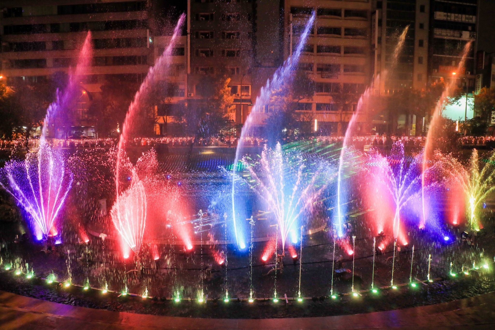 台中耶誕嘉年華今晚試點燈,今年進階版的柳川水舞秀動感再現,水型從1排變3排,使用特殊的旋轉噴頭,做出更多造型和變化。水舞表演過程搭配周邊草地燈及植栽投射燈光,加上雷射燈片投射出各種耶誕圖案如耶誕樹、煙火,透過水舞、燈光與雷射交織合奏出一曲台中的耶誕幻想曲。
