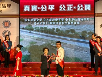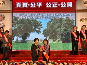 台中市政府地政局工程連續2年榮獲國家建築金獎肯定,第23屆「國家建築金獎」今(15)日於台北國軍英雄館舉行頒獎典禮,地政局共獲得3座公共建設優質獎,地政局長吳存金率隊領獎表示,獲獎是對地政局最大的肯定,未來將持續用優良的公共建設品質,提供市民更舒適完善的生活環境,讓台中成為最幸福宜居的城市。