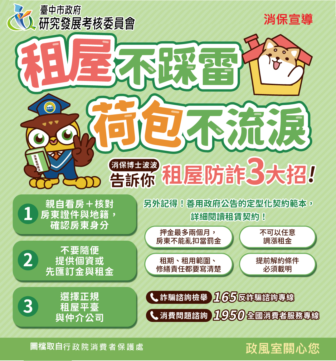 行政院消保處也提醒消費者,如有租屋需求,簽約前除應確實檢視實際屋況,避免日後糾紛外,亦應逐點核對租賃契約內容是否與「住宅租賃定型化契約應記載及不得記載事項」規定相符,倘遇契約內容不合規定時,應請出租人或不動產經紀業改正契約或拒絕簽約,並可向各直轄市、縣(市)政府地政局(處)或消保官提出檢舉。
