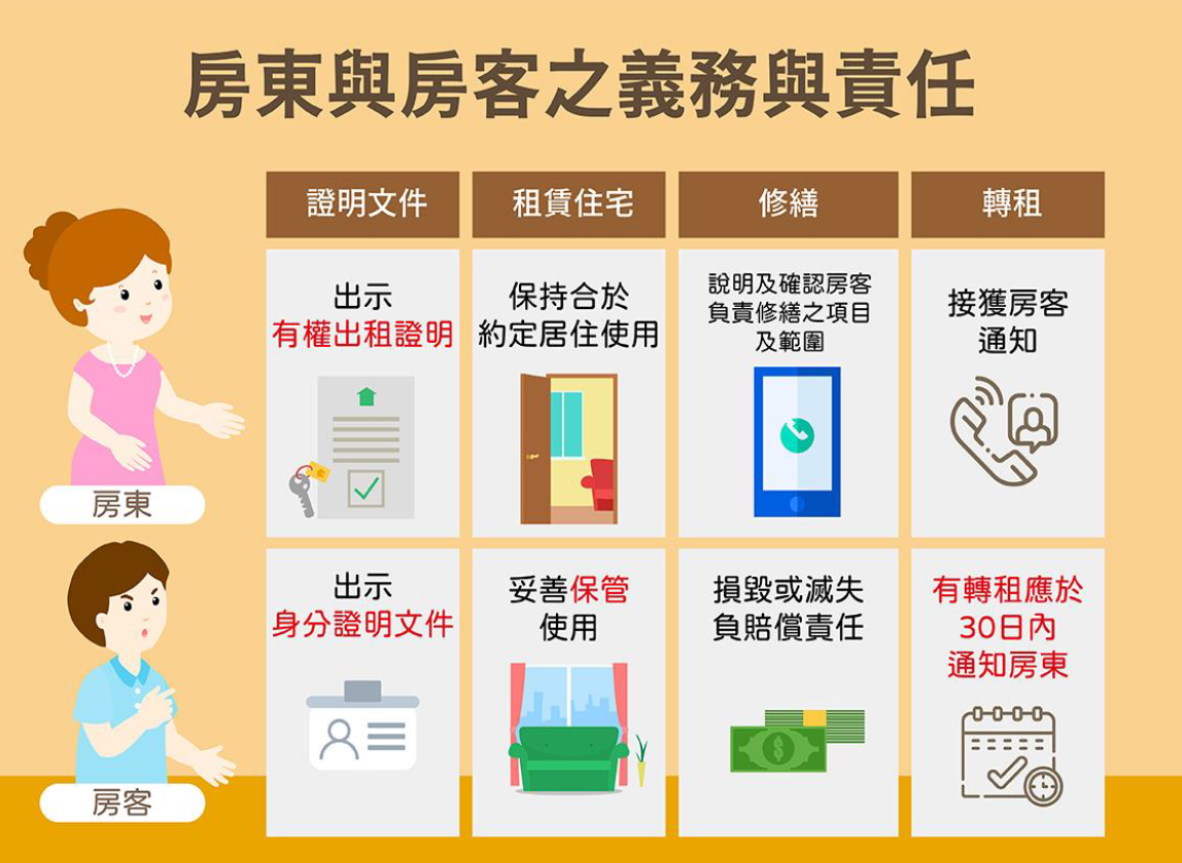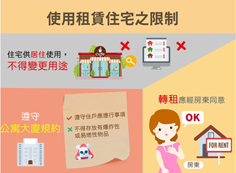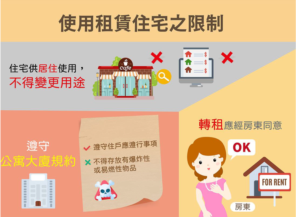 行政院消費者保護處呼籲出租人及不動產經紀業,出租住宅或居間成立租約時,租賃契約內容應符合「住宅租賃定型化契約應記載及不得記載事項」之規定,切勿以不合規定之契約條款,侵害承租人權益。